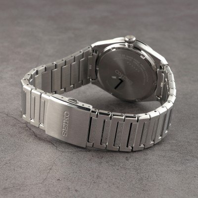 Este relógio Seiko tem uma caixa de Inox com um diâmetro de 38.9 mm e está equipado com uma bracelete de Inox. A caixa possui um movimento Seiko e o relógio tem um vidro Safira.
