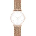Esta bracelete de relógio Skagen é feita de aço inoxidável e está fixada ao relógio através de pinos de pressão. A bracelete tem uma largura de 16 mm e fecha através de fecho milanese. A bracelete não tem uma montagem a direito, o que significa que esta bracelete só é adequada para os relógios listados abaixo.