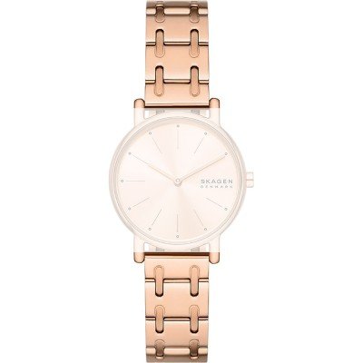 Esta bracelete de relógio Skagen é feita de aço inoxidável e está fixada ao relógio através de pinos carregados por mola de liberação rápida. A bracelete tem uma largura de 14 mm e fecha através de fivela dobrável com botões de pressão. A bracelete tem uma montagem a direito, o que significa que esta bracelete é adequada para todos os relógios Skagen com montagem da bracelete a direito.