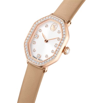 Este relógio Swarovski tem uma caixa de Inox com um diâmetro de 18 mm e está equipado com uma bracelete de couro. A caixa possui um movimento Ronda e o relógio tem um vidro Mineral.
