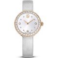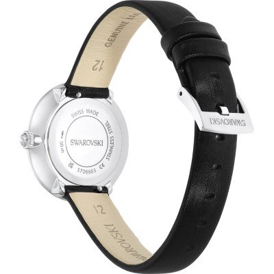 Este relógio Swarovski tem uma caixa de Inox com um diâmetro de 30 mm e está equipado com uma bracelete de couro. A caixa possui um movimento Ronda e o relógio tem um vidro Mineral.