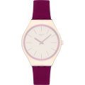 Esta bracelete de relógio Swatch é feita de couro sintético e está fixada ao relógio através de pinos em aço. A bracelete tem uma largura de 15.9 mm e fecha através de fecho. A bracelete não tem uma montagem a direito, o que significa que esta bracelete só é adequada para os relógios listados abaixo.