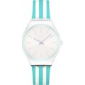Esta bracelete de relógio Swatch é feita de silicone e está fixada ao relógio através de pinos em aço. A bracelete tem uma largura de 15.9 mm e fecha através de fecho. A bracelete não tem uma montagem a direito, o que significa que esta bracelete só é adequada para os relógios listados abaixo.