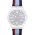 Esta bracelete de relógio Swatch é feita de tecido e está fixada ao relógio através de pinos em aço. A bracelete tem uma largura de 20 mm e fecha através de fecho. A bracelete não tem uma montagem a direito, o que significa que esta bracelete só é adequada para os relógios listados abaixo.
