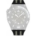 Esta bracelete de relógio Swatch é feita de silicone e está fixada ao relógio através de pinos em aço. A bracelete tem uma largura de 26 mm e fecha através de fecho. A bracelete não tem uma montagem a direito, o que significa que esta bracelete só é adequada para os relógios listados abaixo.