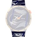 Esta bracelete de relógio Swatch é feita de silicone e está fixada ao relógio através de pinos em aço. A bracelete tem uma largura de 19.7 mm e fecha através de fecho. A bracelete não tem uma montagem a direito, o que significa que esta bracelete só é adequada para os relógios listados abaixo.