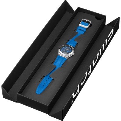 Este relógio Swatch tem uma caixa de Inox com um diâmetro de 33 mm e está equipado com uma bracelete de couro. A caixa possui um movimento ETA e o relógio tem um vidro Acrílico.