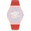 Esta bracelete de relógio Swatch é feita de silicone e está fixada ao relógio através de pinos em aço. A bracelete tem uma largura de 19.7 mm e fecha através de fecho. A bracelete não tem uma montagem a direito, o que significa que esta bracelete só é adequada para os relógios listados abaixo.