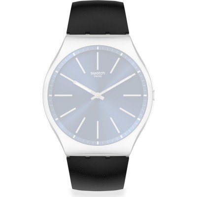 Esta bracelete de relógio Swatch é feita de couro e está fixada ao relógio através de pinos em aço. A bracelete tem uma largura de 20 mm e fecha através de fecho. A bracelete não tem uma montagem a direito, o que significa que esta bracelete só é adequada para os relógios listados abaixo.