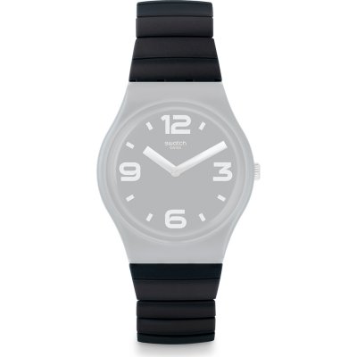 Esta bracelete de relógio Swatch é feita de silicone e aço inoxidável e está fixada ao relógio através de pinos em aço. A bracelete tem uma largura de 17 mm. A bracelete não tem uma montagem a direito, o que significa que esta bracelete só é adequada para os relógios listados abaixo.