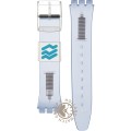 Esta bracelete de relógio Swatch é feita de resina e está fixada ao relógio através de pinos em aço. A bracelete tem uma largura de 17 mm e fecha através de fecho. A bracelete não tem uma montagem a direito, o que significa que esta bracelete só é adequada para os relógios listados abaixo.