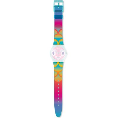 Esta bracelete de relógio Swatch é feita de resina e está fixada ao relógio através de pinos em aço. A bracelete tem uma largura de 17 mm e fecha através de fecho. A bracelete não tem uma montagem a direito, o que significa que esta bracelete só é adequada para os relógios listados abaixo.