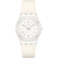 Esta bracelete de relógio Swatch é feita de couro e está fixada ao relógio através de pinos em aço. A bracelete tem uma largura de 17 mm e fecha através de fecho. A bracelete não tem uma montagem a direito, o que significa que esta bracelete só é adequada para os relógios listados abaixo.