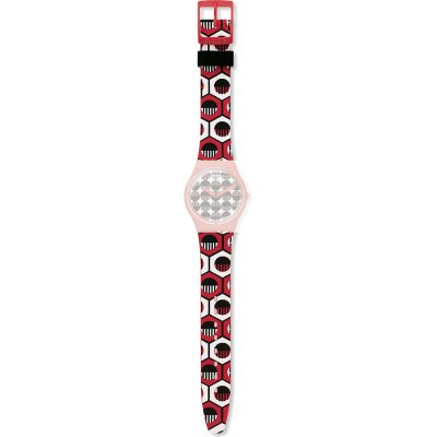 Esta bracelete de relógio Swatch é feita de resina e está fixada ao relógio através de pinos em aço. A bracelete tem uma largura de 17 mm e fecha através de fecho. A bracelete não tem uma montagem a direito, o que significa que esta bracelete só é adequada para os relógios listados abaixo.