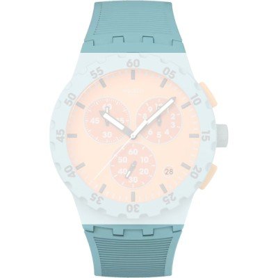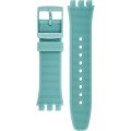 Esta bracelete de relógio Swatch é feita de silicone e está fixada ao relógio através de pinos em aço. A bracelete tem uma largura de 20.1 mm e fecha através de fecho. A bracelete não tem uma montagem a direito, o que significa que esta bracelete só é adequada para os relógios listados abaixo.