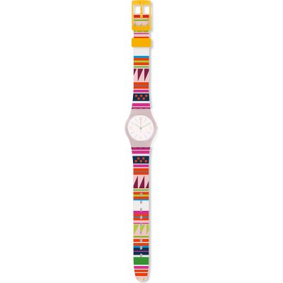 Esta bracelete de relógio Swatch é feita de silicone e está fixada ao relógio através de pinos em aço. A bracelete tem uma largura de 12 mm e fecha através de fecho. A bracelete não tem uma montagem a direito, o que significa que esta bracelete só é adequada para os relógios listados abaixo.