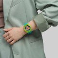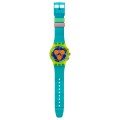 Este relógio Swatch tem uma caixa de Resina com um diâmetro de 42 mm e está equipado com uma bracelete de borracha. A caixa possui um movimento ETA e o relógio tem um vidro Acrílico.