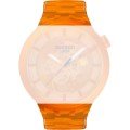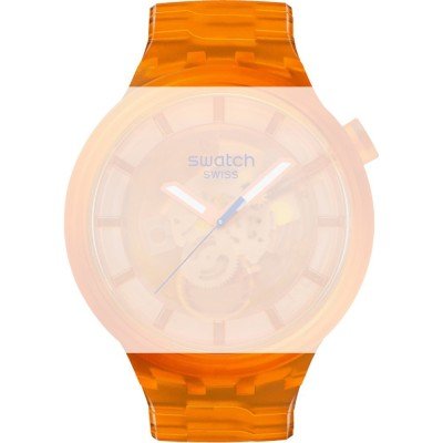 Esta bracelete de relógio Swatch é feita de plástico de origem biológica e está fixada ao relógio através de pinos em aço. A bracelete tem uma largura de 19.7 mm e fecha através de fivela butterfly com botões de pressão. A bracelete não tem uma montagem a direito, o que significa que esta bracelete só é adequada para os relógios listados abaixo.