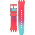 Esta bracelete de relógio Swatch é feita de silicone e está fixada ao relógio através de pinos em aço. A bracelete tem uma largura de 20.1 mm e fecha através de fecho. A bracelete não tem uma montagem a direito, o que significa que esta bracelete só é adequada para os relógios listados abaixo.