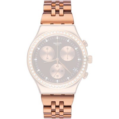 Esta bracelete de relógio Swatch é feita de aço inoxidável e está fixada ao relógio através de pinos em aço. A bracelete tem uma largura de 19.7 mm e fecha através de fivela dobrável com segurança. A bracelete não tem uma montagem a direito, o que significa que esta bracelete só é adequada para os relógios listados abaixo.