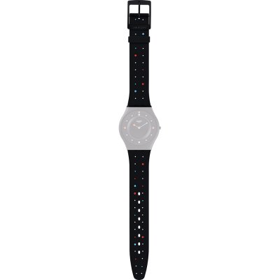 Esta bracelete de relógio Swatch é feita de silicone e está fixada ao relógio através de pinos em aço. A bracelete tem uma largura de 16.5 mm e fecha através de fecho. A bracelete não tem uma montagem a direito, o que significa que esta bracelete só é adequada para os relógios listados abaixo.