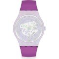 Esta bracelete de relógio Swatch é feita de silicone e está fixada ao relógio através de pinos em aço. A bracelete tem uma largura de 19.7 mm e fecha através de fecho. A bracelete não tem uma montagem a direito, o que significa que esta bracelete só é adequada para os relógios listados abaixo.