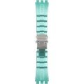 Esta bracelete de relógio Swatch é feita de resina e está fixada ao relógio através de pinos em aço. A bracelete tem uma largura de 23 mm e fecha através de fivela dobrável com botões de pressão e segurança. A bracelete não tem uma montagem a direito, o que significa que esta bracelete só é adequada para os relógios listados abaixo.