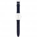Esta bracelete de relógio Swatch é feita de couro e está fixada ao relógio através de pinos em aço. A bracelete tem uma largura de 19.7 mm e fecha através de fecho. A bracelete não tem uma montagem a direito, o que significa que esta bracelete só é adequada para os relógios listados abaixo.