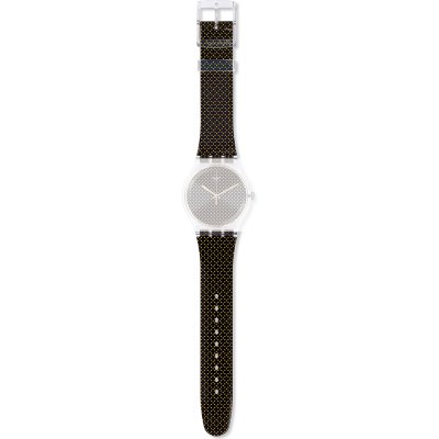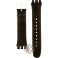Esta bracelete de relógio Swatch é feita de silicone e está fixada ao relógio através de pinos em aço. A bracelete tem uma largura de 19.7 mm e fecha através de fecho. A bracelete não tem uma montagem a direito, o que significa que esta bracelete só é adequada para os relógios listados abaixo.