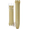 Esta bracelete de relógio Swatch é feita de resina e está fixada ao relógio através de pinos em aço. A bracelete tem uma largura de 19.7 mm e fecha através de fecho. A bracelete não tem uma montagem a direito, o que significa que esta bracelete só é adequada para os relógios listados abaixo.