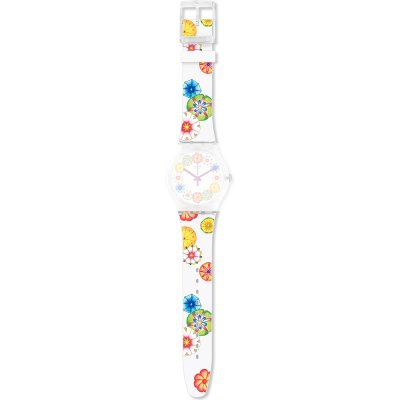 Esta bracelete de relógio Swatch é feita de silicone e está fixada ao relógio através de pinos em aço. A bracelete tem uma largura de 19.7 mm e fecha através de fecho. A bracelete não tem uma montagem a direito, o que significa que esta bracelete só é adequada para os relógios listados abaixo.