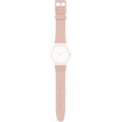 Esta bracelete de relógio Swatch é feita de silicone e está fixada ao relógio através de pinos em aço. A bracelete tem uma largura de 19.7 mm e fecha através de fecho. A bracelete não tem uma montagem a direito, o que significa que esta bracelete só é adequada para os relógios listados abaixo.