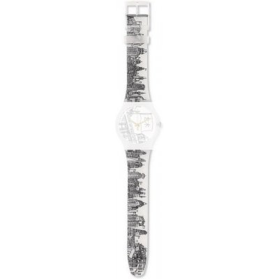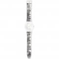 Esta bracelete de relógio Swatch é feita de silicone e está fixada ao relógio através de pinos em aço. A bracelete tem uma largura de 19.7 mm e fecha através de fecho. A bracelete não tem uma montagem a direito, o que significa que esta bracelete só é adequada para os relógios listados abaixo.