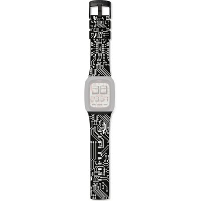 Esta bracelete de relógio Swatch é feita de silicone e está fixada ao relógio através de pinos em aço. A bracelete tem uma largura de 28 mm e fecha através de fecho. A bracelete não tem uma montagem a direito, o que significa que esta bracelete só é adequada para os relógios listados abaixo.