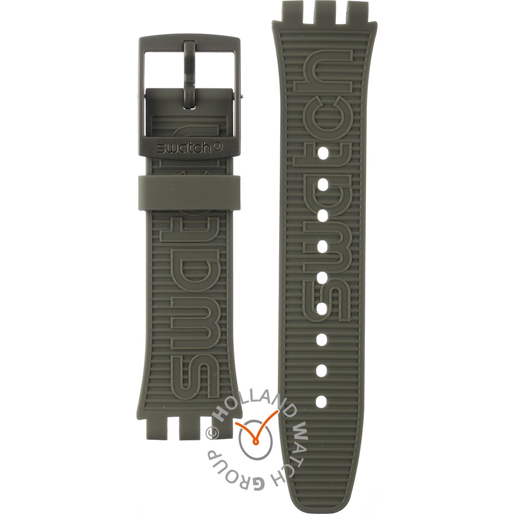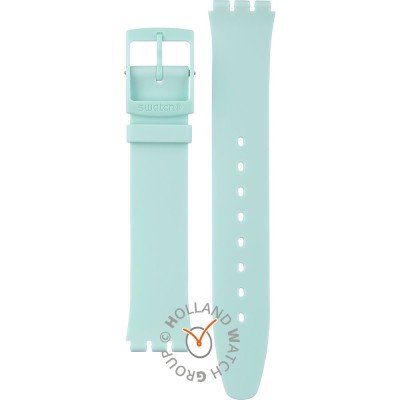 Esta bracelete de relógio Swatch é feita de silicone e está fixada ao relógio através de pinos em aço. A bracelete tem uma largura de 20.1 mm e fecha através de fecho. A bracelete não tem uma montagem a direito, o que significa que esta bracelete só é adequada para os relógios listados abaixo.