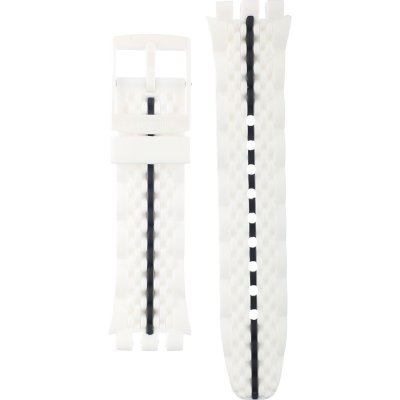 Esta bracelete de relógio Swatch é feita de silicone e está fixada ao relógio através de pinos em aço. A bracelete tem uma largura de 20.1 mm e fecha através de fecho. A bracelete não tem uma montagem a direito, o que significa que esta bracelete só é adequada para os relógios listados abaixo.