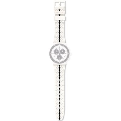 Esta bracelete de relógio Swatch é feita de silicone e está fixada ao relógio através de pinos em aço. A bracelete tem uma largura de 20.1 mm e fecha através de fecho. A bracelete não tem uma montagem a direito, o que significa que esta bracelete só é adequada para os relógios listados abaixo.