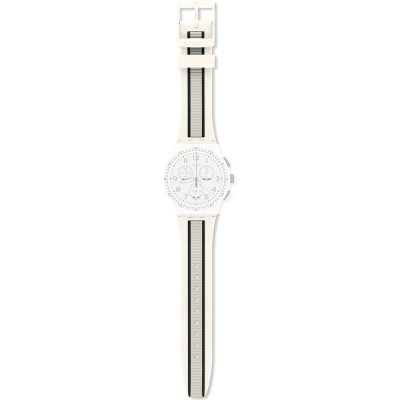 Esta bracelete de relógio Swatch é feita de silicone e está fixada ao relógio através de pinos em aço. A bracelete tem uma largura de 20.1 mm e fecha através de fecho. A bracelete não tem uma montagem a direito, o que significa que esta bracelete só é adequada para os relógios listados abaixo.