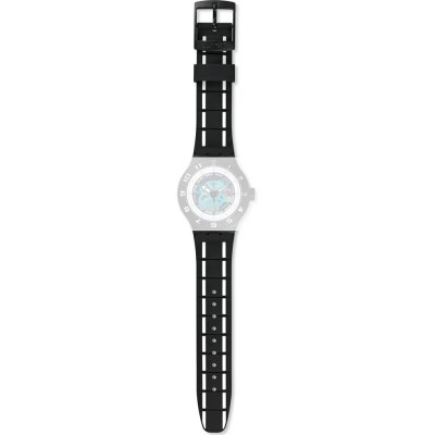 Esta bracelete de relógio Swatch é feita de silicone e está fixada ao relógio através de pinos em aço. A bracelete tem uma largura de 21.3 mm e fecha através de fecho. A bracelete não tem uma montagem a direito, o que significa que esta bracelete só é adequada para os relógios listados abaixo.