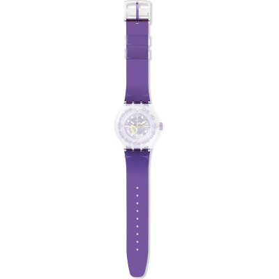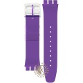 Esta bracelete de relógio Swatch é feita de silicone e está fixada ao relógio através de pinos em aço. A bracelete tem uma largura de 21.3 mm e fecha através de fecho. A bracelete não tem uma montagem a direito, o que significa que esta bracelete só é adequada para os relógios listados abaixo.