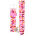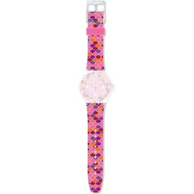 Esta bracelete de relógio Swatch é feita de silicone e está fixada ao relógio através de pinos em aço. A bracelete tem uma largura de 21.3 mm e fecha através de fecho. A bracelete não tem uma montagem a direito, o que significa que esta bracelete só é adequada para os relógios listados abaixo.