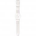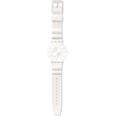 Esta bracelete de relógio Swatch é feita de silicone e está fixada ao relógio através de pinos em aço. A bracelete tem uma largura de 21.3 mm e fecha através de fecho. A bracelete não tem uma montagem a direito, o que significa que esta bracelete só é adequada para os relógios listados abaixo.