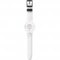 Esta bracelete de relógio Swatch é feita de silicone e está fixada ao relógio através de pinos em aço. A bracelete tem uma largura de 21.3 mm e fecha através de fecho. A bracelete não tem uma montagem a direito, o que significa que esta bracelete só é adequada para os relógios listados abaixo.