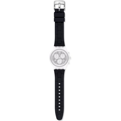 Esta bracelete de relógio Swatch é feita de silicone e está fixada ao relógio através de pinos em aço. A bracelete tem uma largura de 19.9 mm e fecha através de fecho. A bracelete não tem uma montagem a direito, o que significa que esta bracelete só é adequada para os relógios listados abaixo.