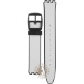 Esta bracelete de relógio Swatch é feita de silicone e está fixada ao relógio através de pinos em aço. A bracelete tem uma largura de 14.6 mm e fecha através de fecho. A bracelete não tem uma montagem a direito, o que significa que esta bracelete só é adequada para os relógios listados abaixo.