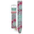 Esta bracelete de relógio Swatch é feita de silicone e está fixada ao relógio através de pinos em aço. A bracelete tem uma largura de 14.6 mm e fecha através de fecho. A bracelete não tem uma montagem a direito, o que significa que esta bracelete só é adequada para os relógios listados abaixo.