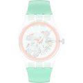 Esta bracelete de relógio Swatch é feita de silicone / Borracha e está fixada ao relógio através de pinos em aço. A bracelete tem uma largura de 19.7 mm e fecha através de fecho. A bracelete não tem uma montagem a direito, o que significa que esta bracelete só é adequada para os relógios listados abaixo.