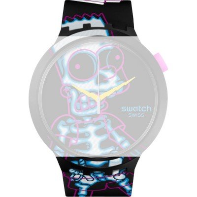Esta bracelete de relógio Swatch é feita de silicone e está fixada ao relógio através de pinos em aço. A bracelete tem uma largura de 19.7 mm e fecha através de fecho. A bracelete não tem uma montagem a direito, o que significa que esta bracelete só é adequada para os relógios listados abaixo.