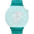 Esta bracelete de relógio Swatch é feita de plástico de origem biológica e está fixada ao relógio através de pinos em aço. A bracelete tem uma largura de 19.7 mm e fecha através de fivela butterfly com botões de pressão. A bracelete não tem uma montagem a direito, o que significa que esta bracelete só é adequada para os relógios listados abaixo.