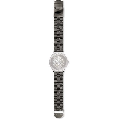 Esta bracelete de relógio Swatch é feita de aço inoxidável e está fixada ao relógio através de pinos em aço. A bracelete tem uma largura de 17 mm e fecha através de fivela dobrável com segurança. A bracelete não tem uma montagem a direito, o que significa que esta bracelete só é adequada para os relógios listados abaixo.